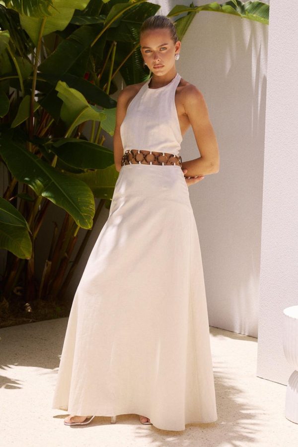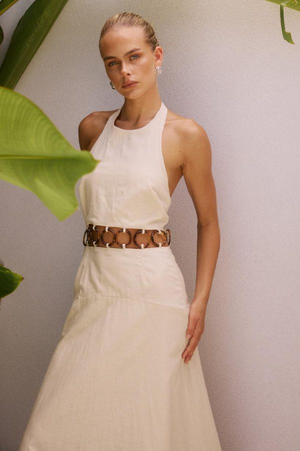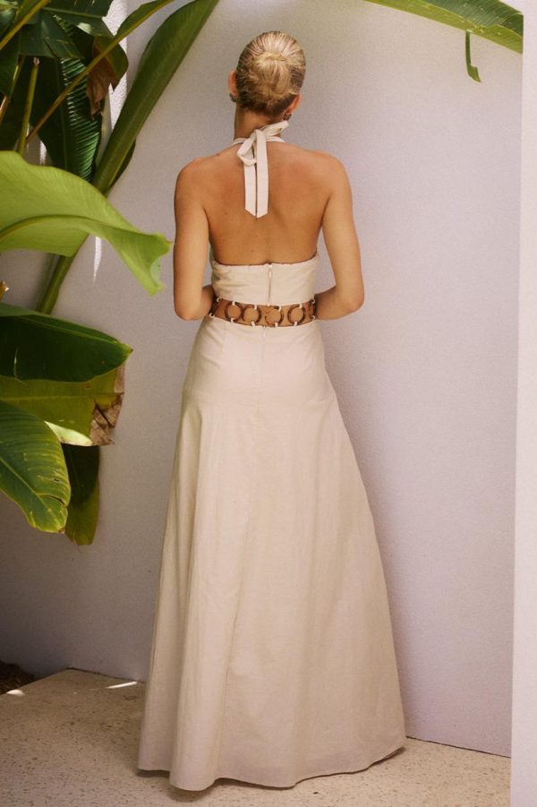 The perfect daytime dress, our Rafina Maxi Dress features a halter neck tie and resin ring detail around the waist.