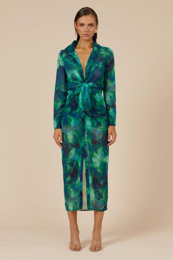 Our Calista Shirt Dress features a midi length, centre-front buttons, long sleeves, centre front split and self-ties around the waist. No lining and no stretch. Please note this garment is slightly sheer, pair with our Calista Brief for more coverage. 100% Polyester. Please refer to care label for garment care instructions. Please refer to care label for garment care instructions.